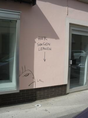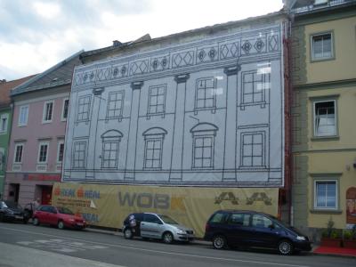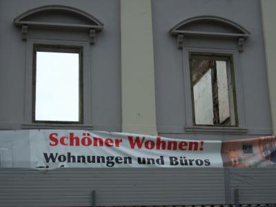 Ein Investment, das mitten in die Stadt einschlägt, wie eine Fliegerbombe im Zweiten Weltkrieg. Haus weg, denkmalgeschütze Fassade noch da, die Fenster weisen ins Leere, katholisch gesehen in den Himmel; Gras kann da keines drüberwachsen. Also Vorhang runter, halbtransparent mit klassizistischen Ornamenten, um das Stadtbild nicht zu stören. Ein authentischeres Erinnerungszeichen für den ganzen Investorenschwarm, der an anderen Stellen der Stadt noch viel übler zugeschlagen hat, läßt sich kaum denken. Trotzdem gibt es noch Leute, die selbst angesichts solcher stadtarchitektonisch-erinnerungskultureller Meisterleistungen nicht aufhören öffentlich herum zu meckern. Zum Beispiel beim 'Lufthaus' gleich um die Ecke gibt es diese am Boden klebenden Geister, die einfach keine Geschäftsphantasie entwickeln. Unsinnige Fassadensprüher, die 'singen' und was nicht noch alles wollen.