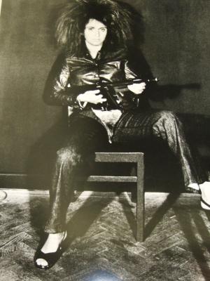 Erinnerungs-Photo von einem Photo einer bedeutenden Aktion Vallie Exports in einem Münchner Pornokino 1969. Sie zeigt bei dieser Aktion dem männlichen Porno-Publikum wie eine "wirkliche Frau" aussieht. Vallie Export, Absolventin einer Linzer Textilschule, geht während der Aktion in der von ihr entworfenen "Aktionshose" auf und ab. Sie schwingt eine Maschinenpistole, die (wahrscheinlich??) kein mit scharfer Munition befülltes Magazin enthält. Durch ihre im Schritt offene "Aktionhose" ist Valie Export vaginal entblößt. Der Schutz ihrer Vagina vor allfälligen Aktionen der Pornokinogeher wird anstelle der Bekleidung durch die Maschinenpistole gewährleistet. Allein das drohende Schwingen der Tötungsmaschine hat die bayrischen Männer hinreichend eingeschüchtert und aktionsunfähig gemacht. Es ist die Zeit der sich formierenden militanten R.A.F., die einen hohen Frauenanteil auch in ihren Leitungsebenen hat. Die photographisch dokumentierte Aktion der renommierten Künstlerin nimmt überaschend präzis sehr wesentliche Strukturelemente in den Gender-Verhältnissen der Jahrzehnte 'nach 68' und speziell ab den 90er Jahren vorweg. Frauen können sich nun sooft und solange sie sich am Liebes- und Beziehungsmarkt feil halten möchten in erheblich größerer Freiheit als 'sexy' gerieren. Den Männern jedoch drohen zunehmend härtere Strafen nach neu definierten Deliktformen durch die staatliche Gewalt, sofern sie ungebeten auf die scheinbar größere Freizügikeit sexuell reagieren. Viele Männer die die psycho- und sozialökonomischen Forderungen der am Liebesmarkt aktiven Frauen nicht erfüllen weichen dann in Krankheit und Depression aus, in homosexuelle Beziehungen oder in neue und zugleich ganz alte Formen der Verachtung, Distanz und des Ekels gegenüber Frauen.